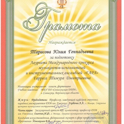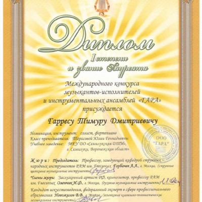 Гаррес Тимур (класс преподавателя Тарасовой Юлии Геннадьевны) стал Лауреатом I степени Международного конкурса музыкантов-исполнителей "Гара"! Поздравляем и гордимся!