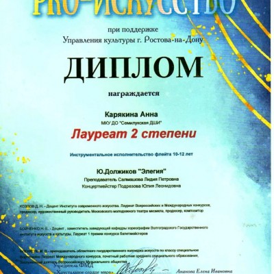 г. Ростова-на-Дону. Учащаяся по классу флейты Карякина Анна(класс преподавателя Салмашовой Л.П.) стала Лауреатом II степени. Поздравляем!